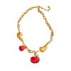 Avec sa chaîne dorée lumineuse et ses pendentifs au design organique, il joue sur les contrastes entre douceur et caractère. Le cœur rouge apporte une touche sensuelle et captivante, tandis que les formes dorées ajoutent une dimension moderne et sophistiquée.