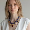 Ses perles bleu profond, sublimées par des détails dorés et des pendentifs inspirés de symboles intemporels, créent une pièce forte qui attire naturellement le regard.